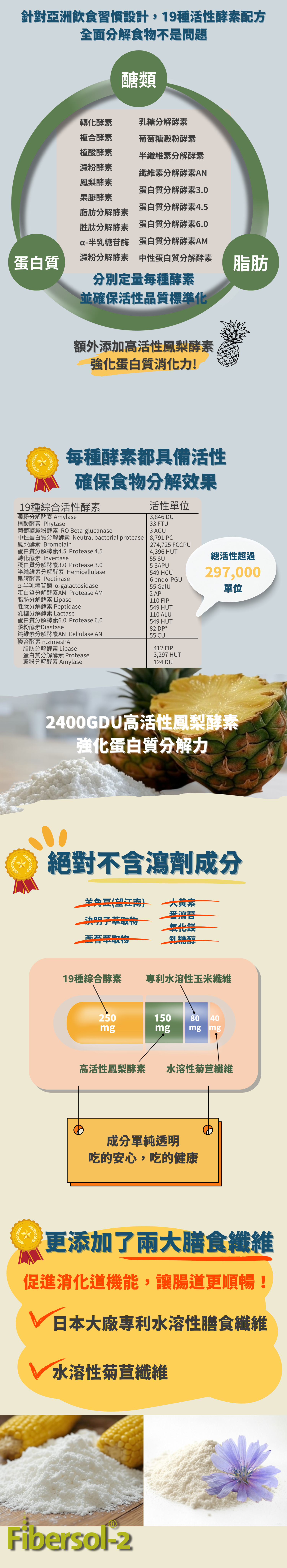 1. 酵素成分選用美國酵素大廠Deerland針對亞洲飲食習慣設計的配方,包含19種活性酵素,全面涵蓋脂肪、蛋白質、醣類三大食物成分。